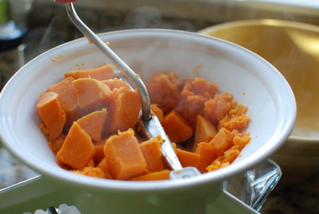 Mash the yams. I’m using a food mill. You can use a potato masher, ricer, or food mill.