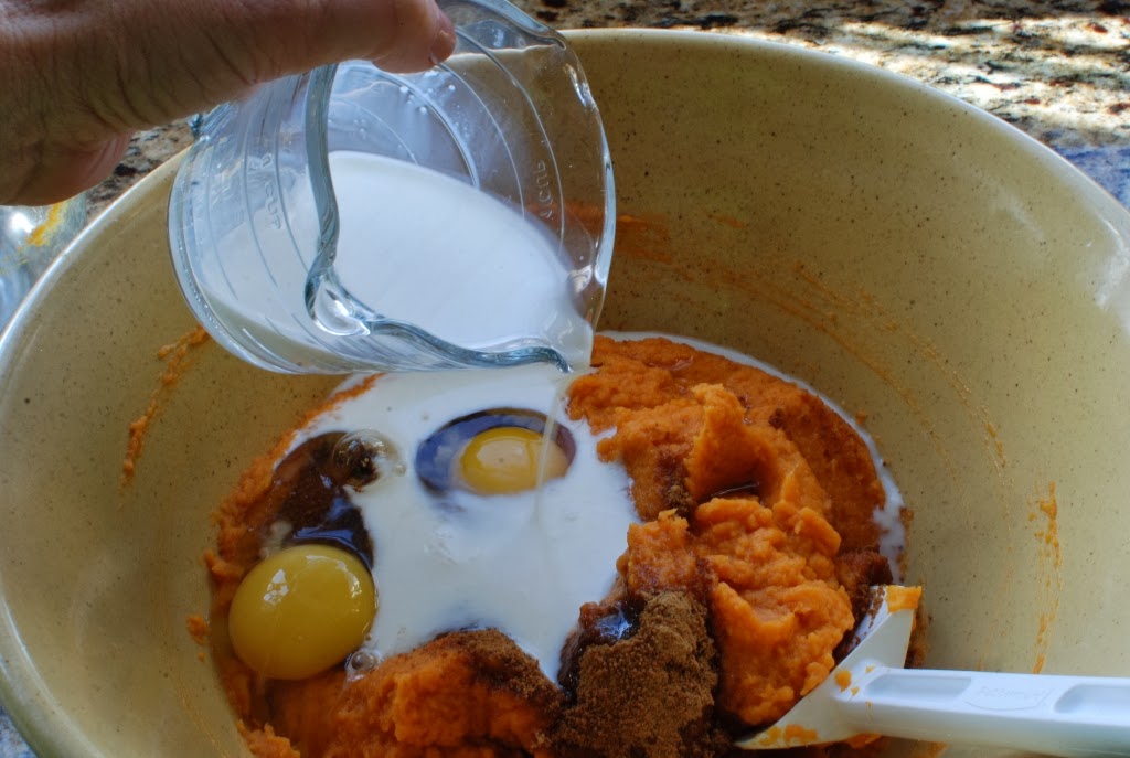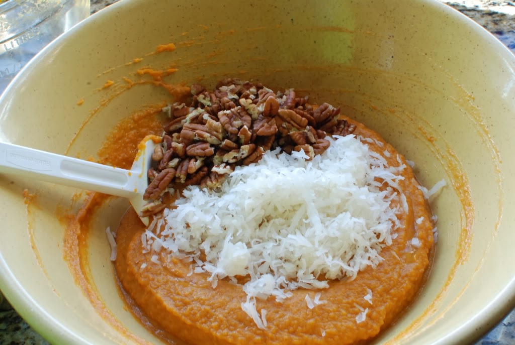 together mashed yams, sugar, eggs, milk, butter, nuts, coconut raisins and
