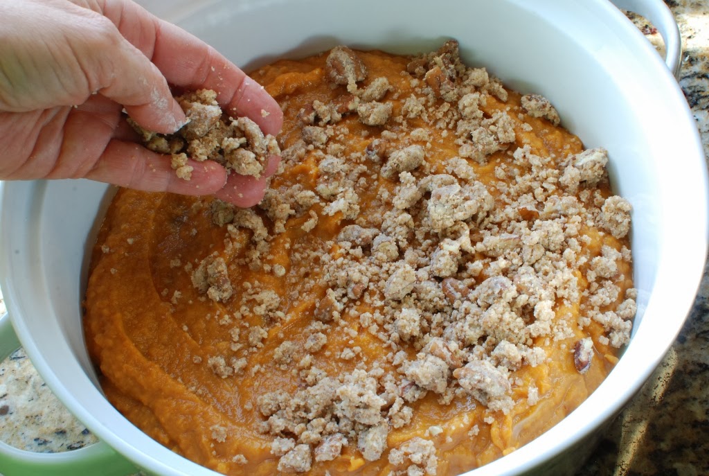 becomes crumbly. Add nuts. Sprinkle over top of yam mixture. Bake, uncovered for 30 minutes at 400