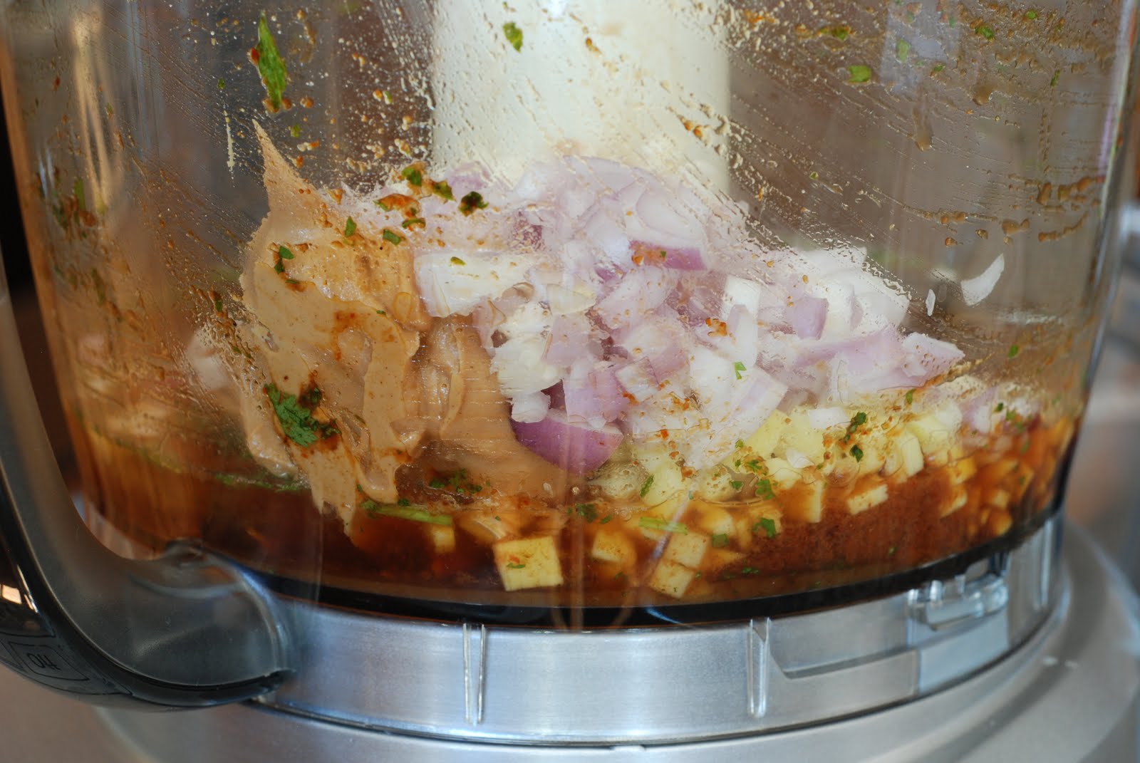 In the same food processor bowl (it’s not necessary to wash the bowl) add brown sugar, lime juice, curry paste, peanut butter, water, shallots, ginger and garlic. Process until smooth. Transfer to a serving bowl